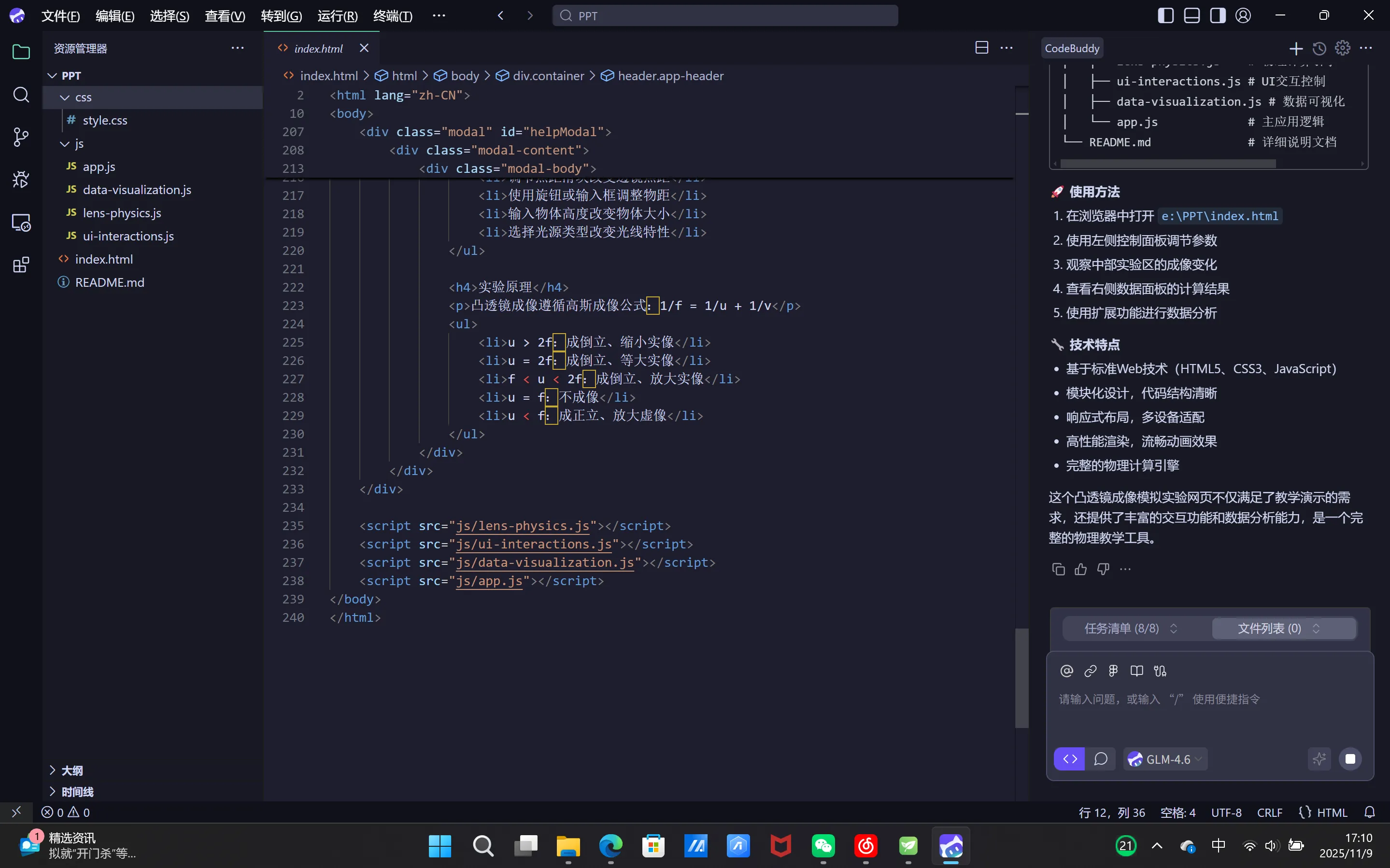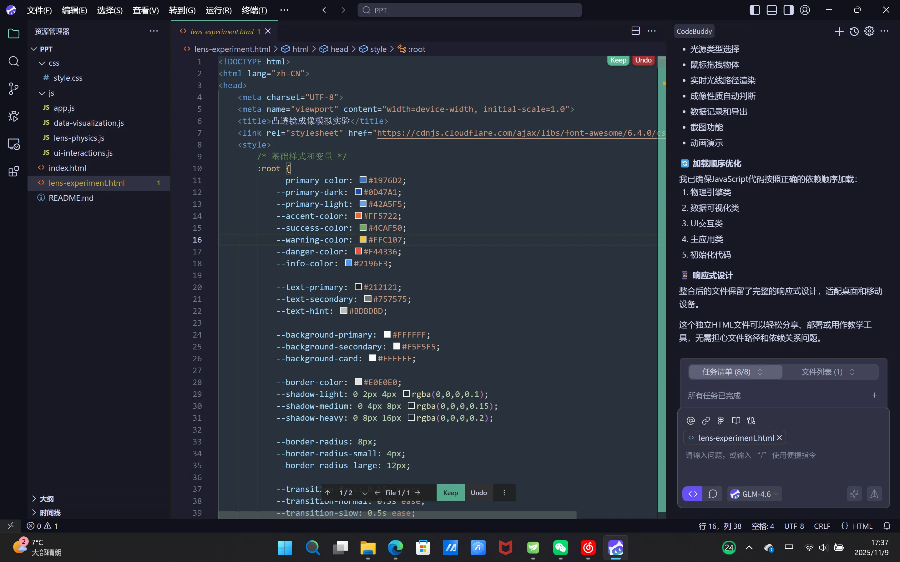 开发一个现代化响应式设计的凸透镜成像模拟实验网页,采用HTML+CSS+JS实现。具体要求如下: