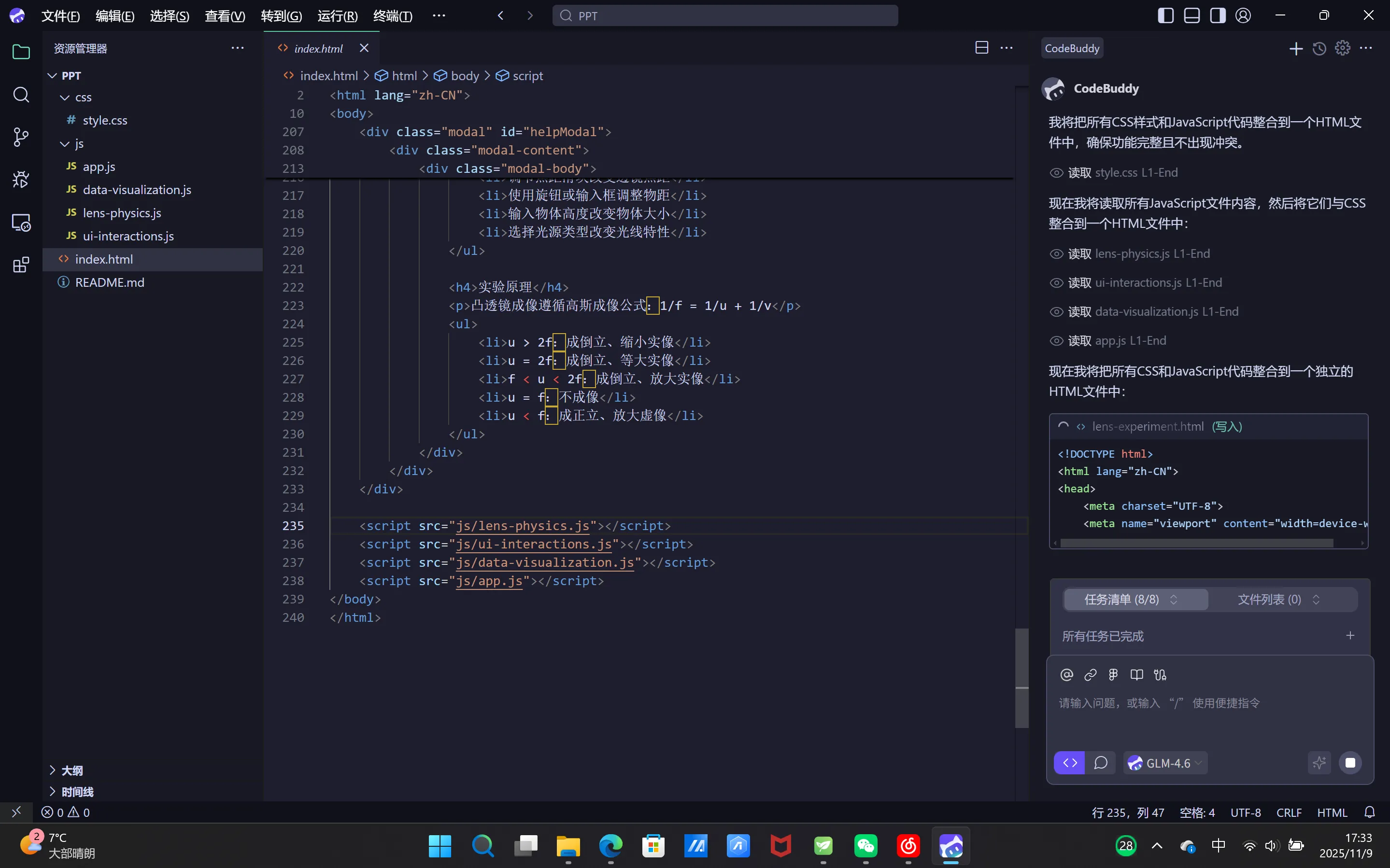 等待一会儿就可以得到完美的网页,但是这个网站的CSS和JS是分开的,会导致插入到PPT中的效果会变,所以要让它去更改。