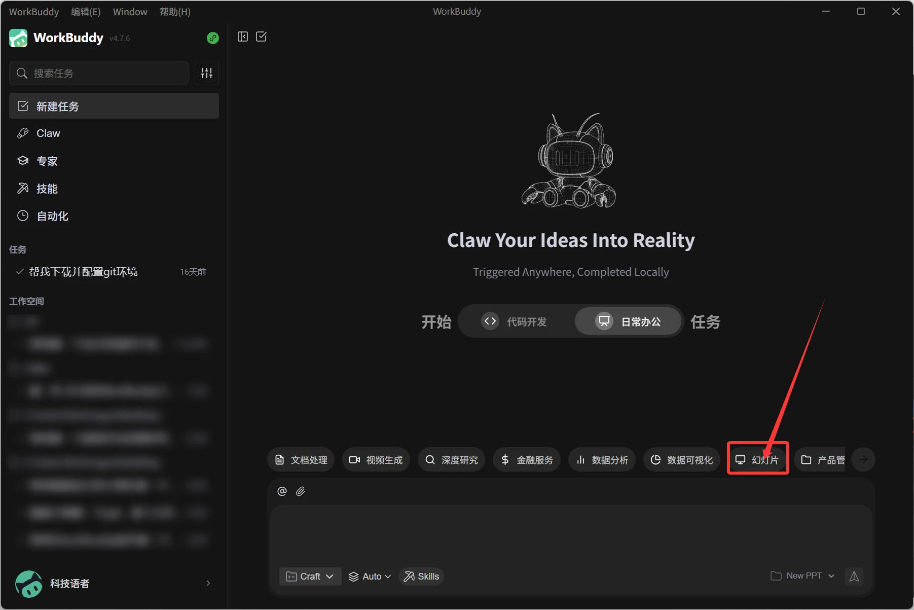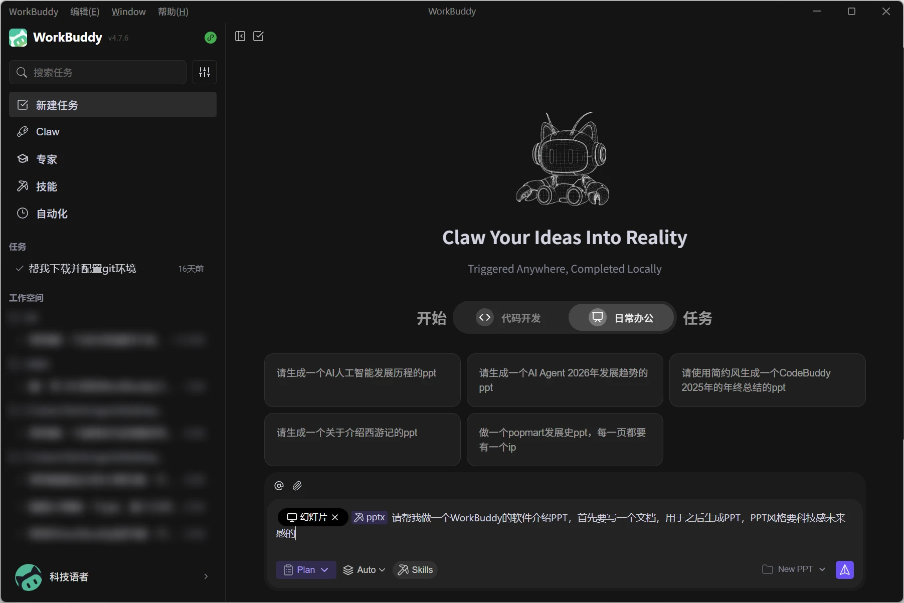 如果说传统的 AI 助手(如 ChatGPT)是「动嘴」的参谋,那 WorkBuddy 就是「动手」的助理。它基于腾讯的 OpenClaw 生态,能够理解你的自然语言指令,并直接在你的电脑或云端执行具体的办公任务——生成 PPT、整理 Excel、提取发票信息……应有尽有。