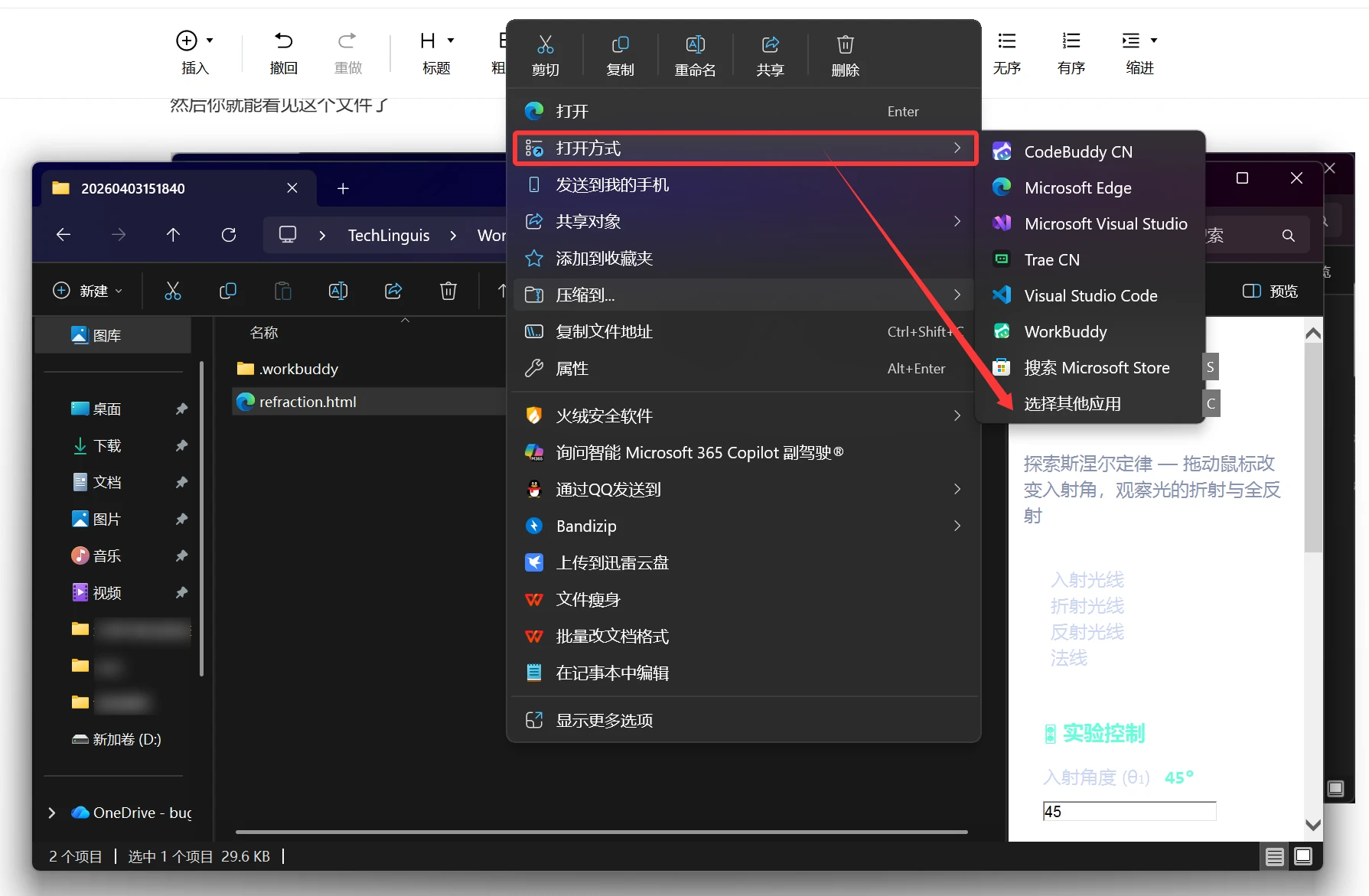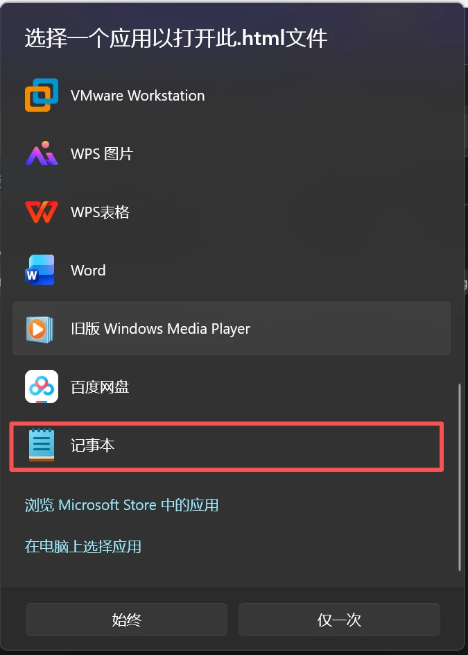 Win + E),在地址栏粘贴路径,删除末尾的文件名后回车 - 找到 HTML 文件 → 右键 → 打开方式 → 选择「记事本」→ 点击「仅一次」