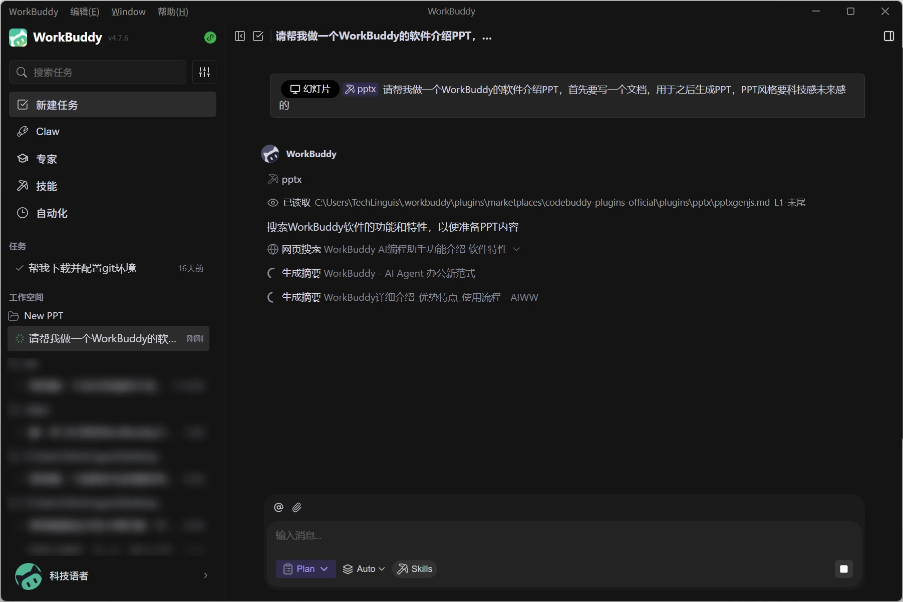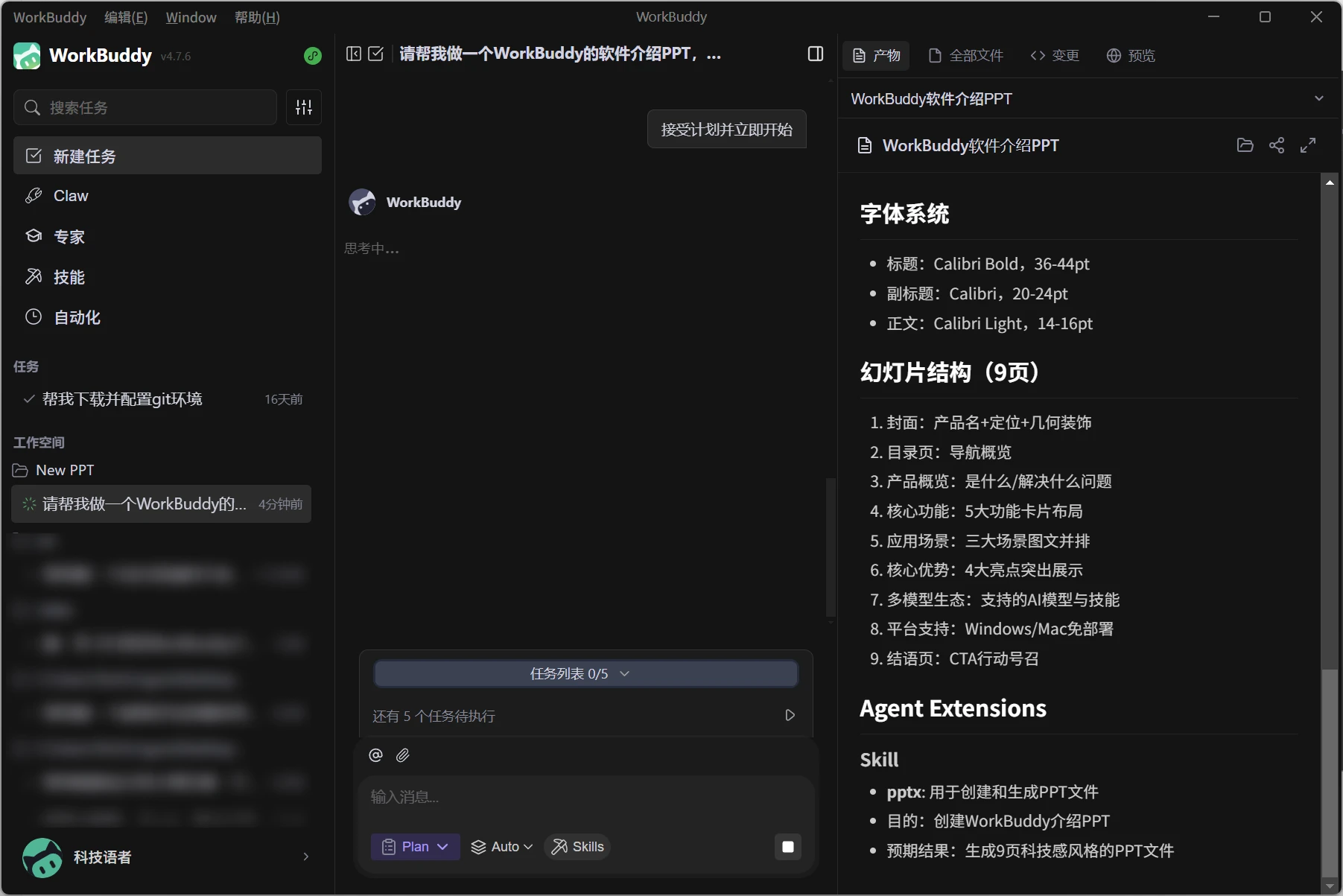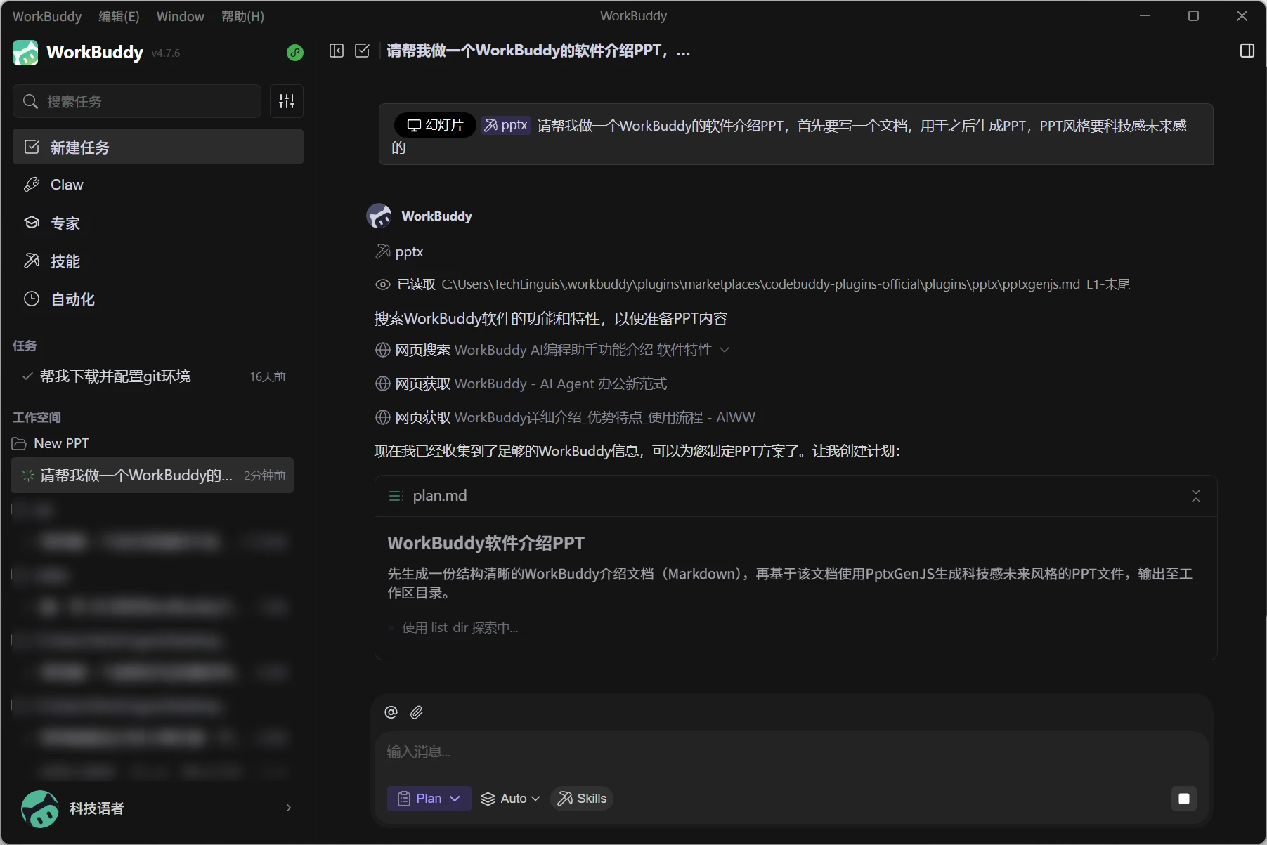 这是 WorkBuddy 最「惊艳」的功能之一——从一句话到完整 PPT,全自动完成。下面以制作「WorkBuddy 软件介绍 PPT」为例,演示完整流程: