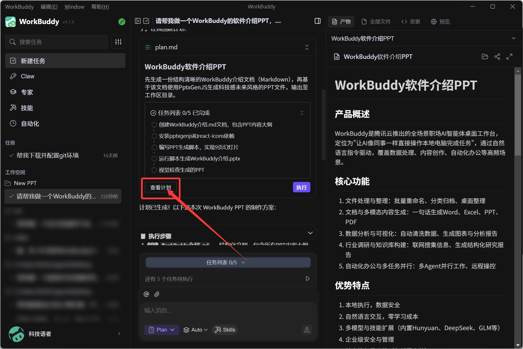 你可以先预览生成的方案,确认内容和结构符合需求后点击「执行」。