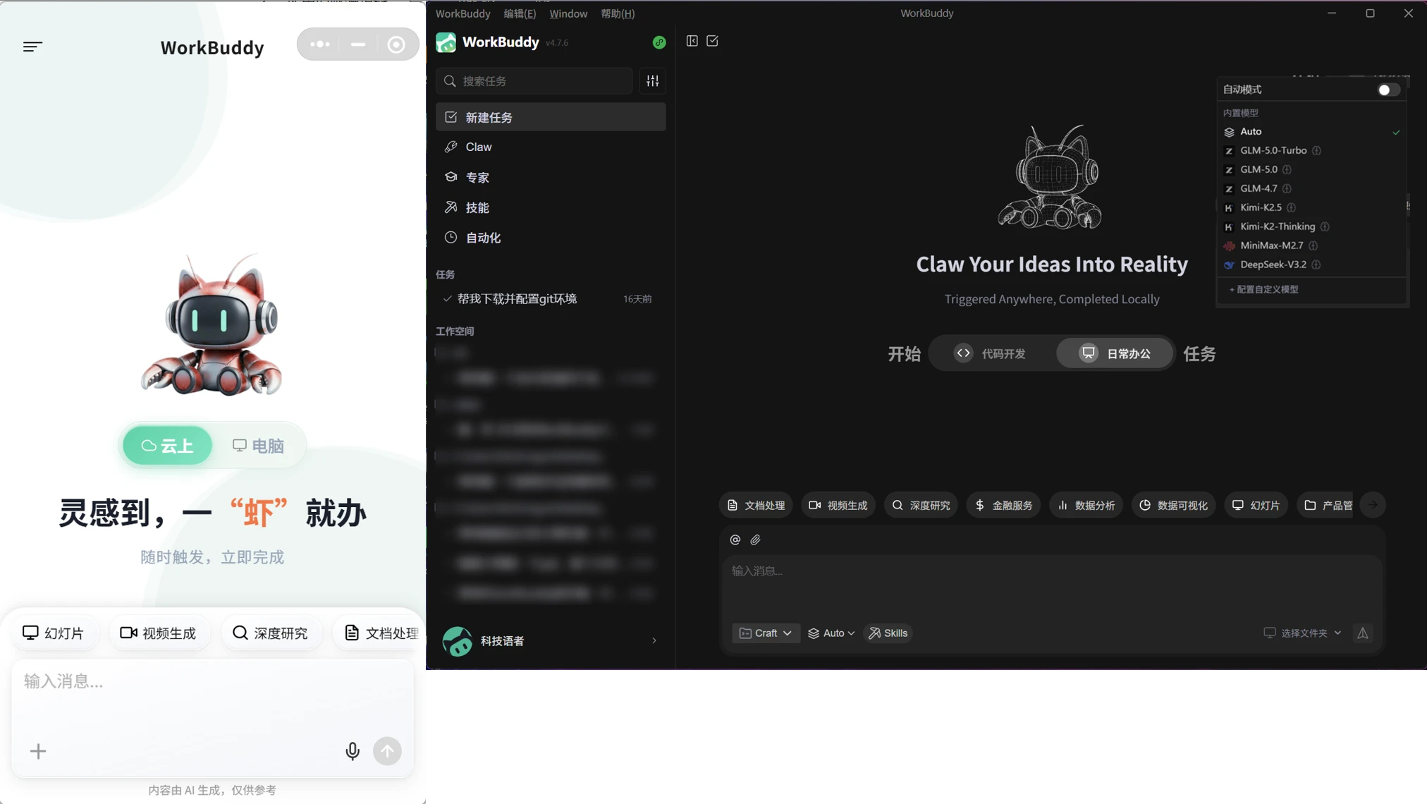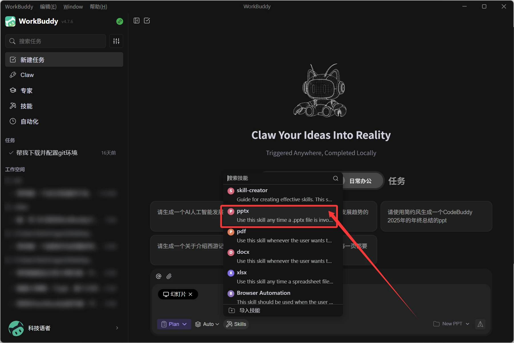 WorkBuddy 集成了 GLM-5、Kimi、MiniMax、DeepSeek 等多个主流大模型,你可以根据任务类型(推理、长文本、视觉)灵活切换。同时,它拥有丰富的 技能(Skills) 市场,可以像安装插件一样扩展能力——做 PPT、画流程图,随心搭配。