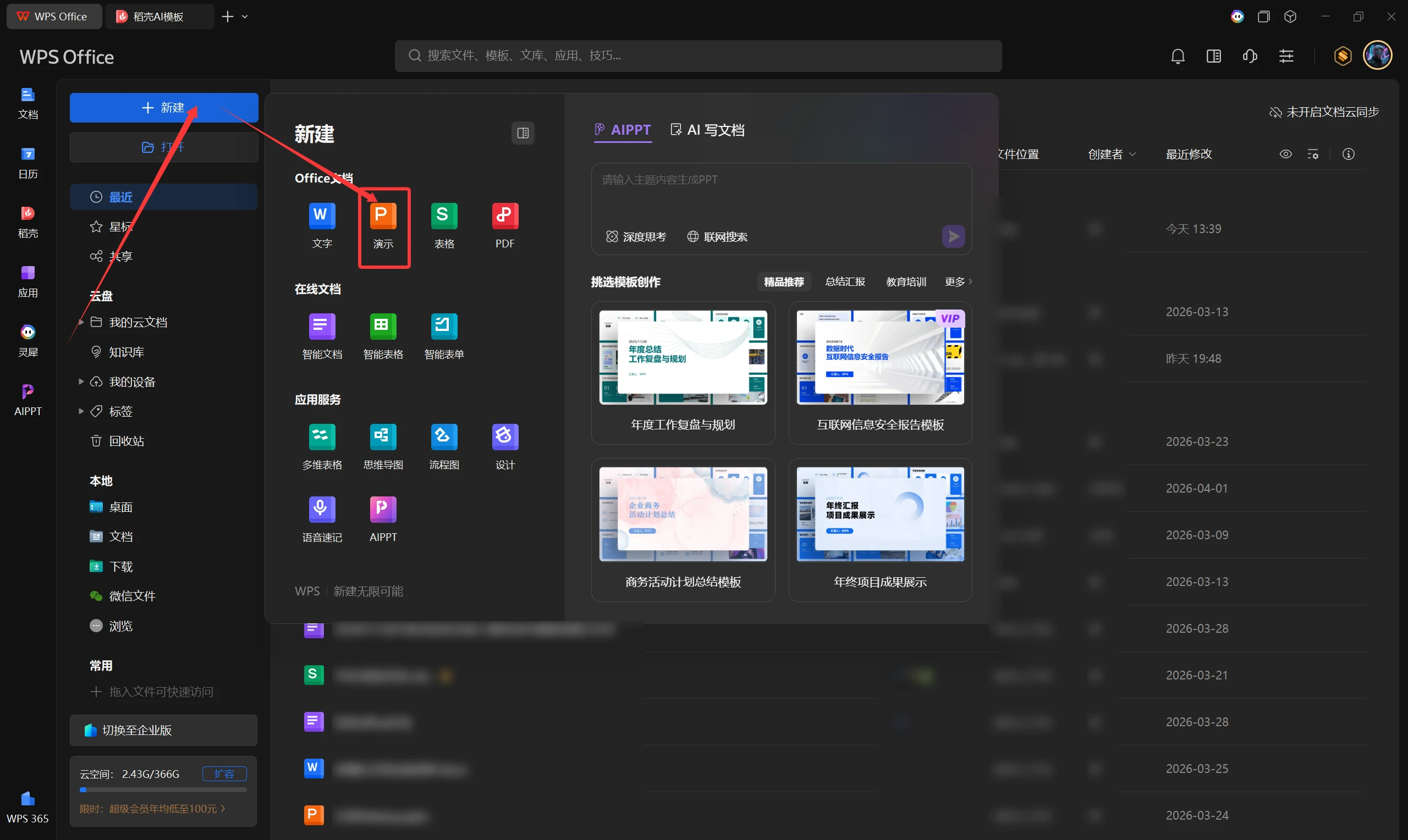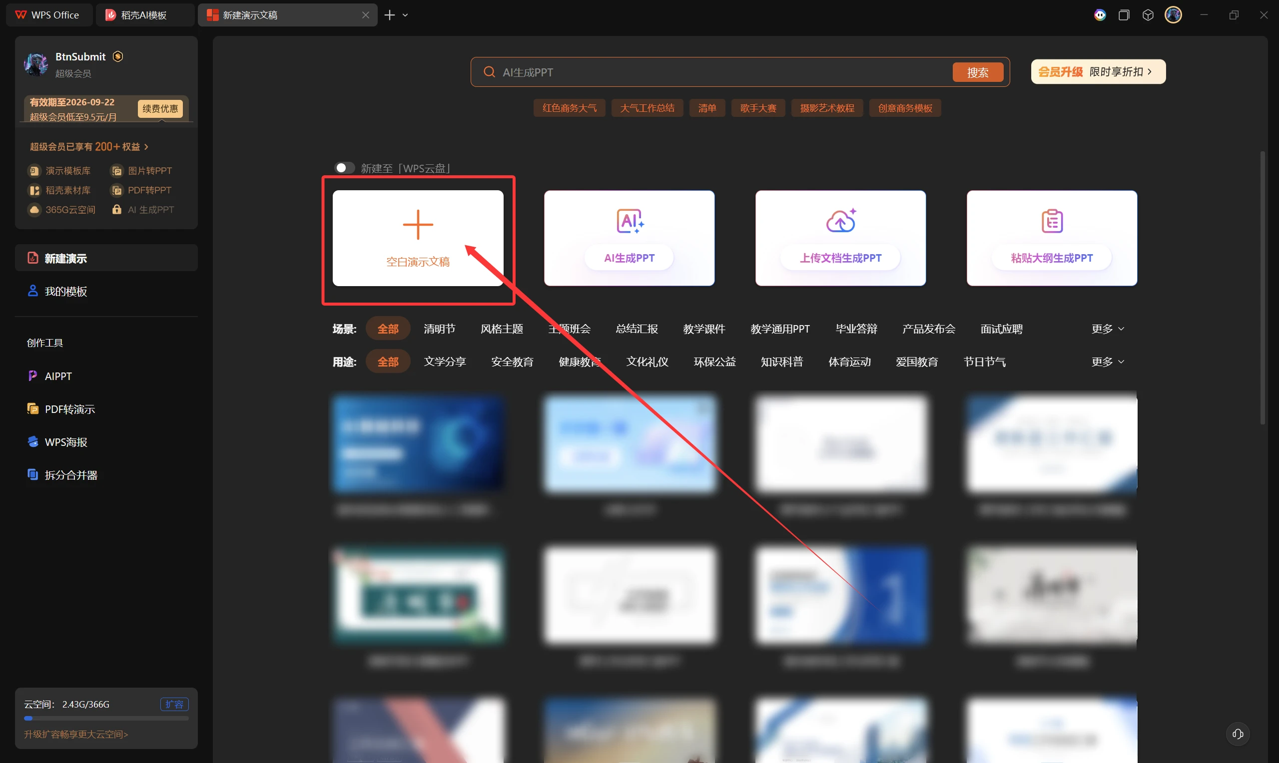 启动 WPS 软件,新建一个空白的演示文稿(PPT)。