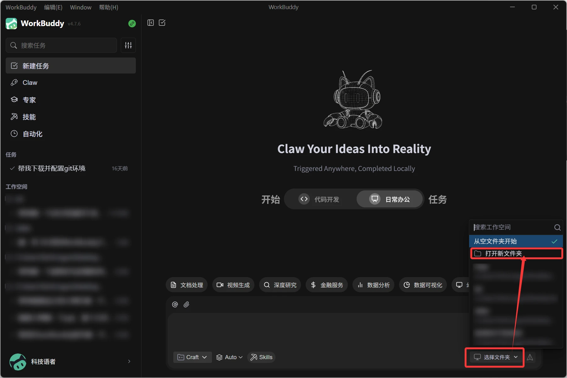 打开一个新文件夹作为工作空间,这是 WorkBuddy 存放项目文件的「基地」。