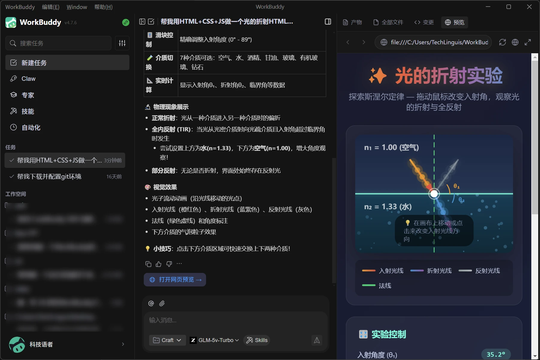 发送完成后,WorkBuddy 会自动生成代码并提供在线实时预览。