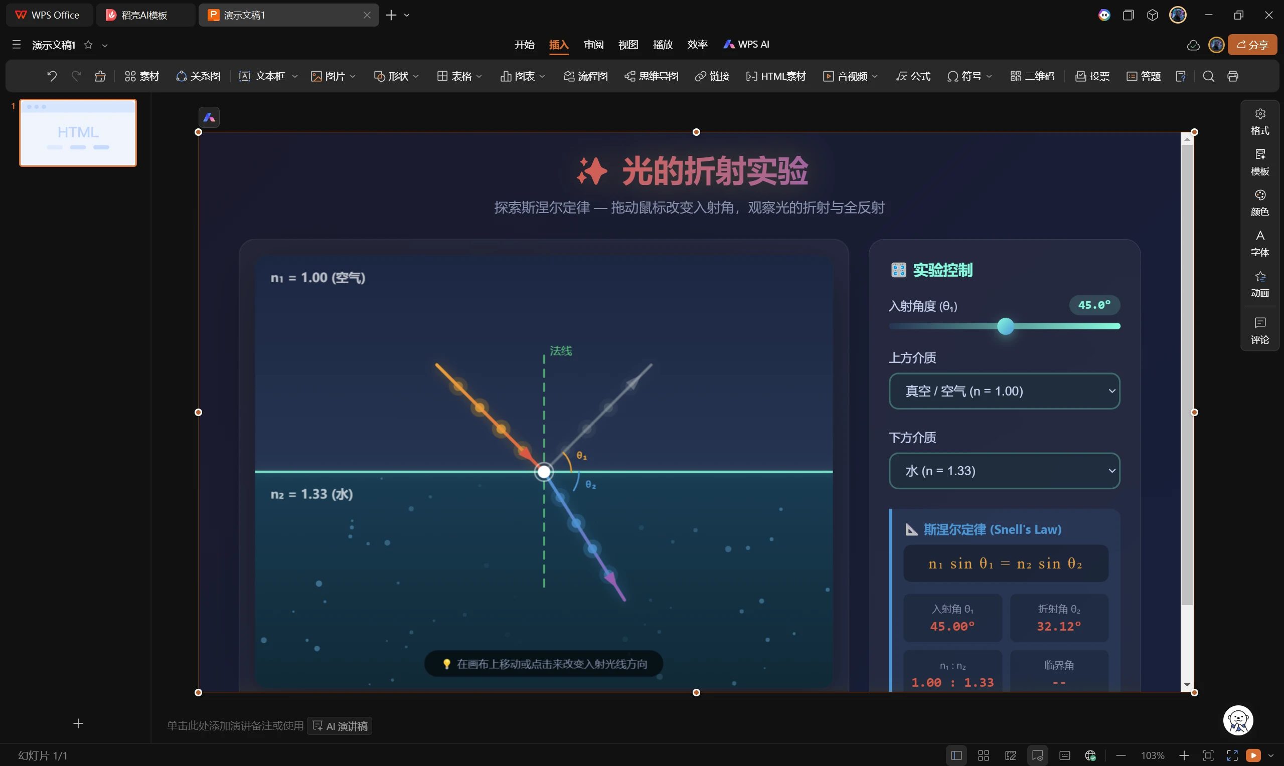 借助 WPS 对 HTML 内容的嵌入式支持,我们能够将原本静态的 PPT 转化为一个可操作、可演示的 轻量化实验平台。教师可以在讲解「小孔成像」时让学生实时调整物距、像距;也可以在演示「光的折射」时动态改变入射角与介质参数,使光线路径与折射规律可视化呈现。