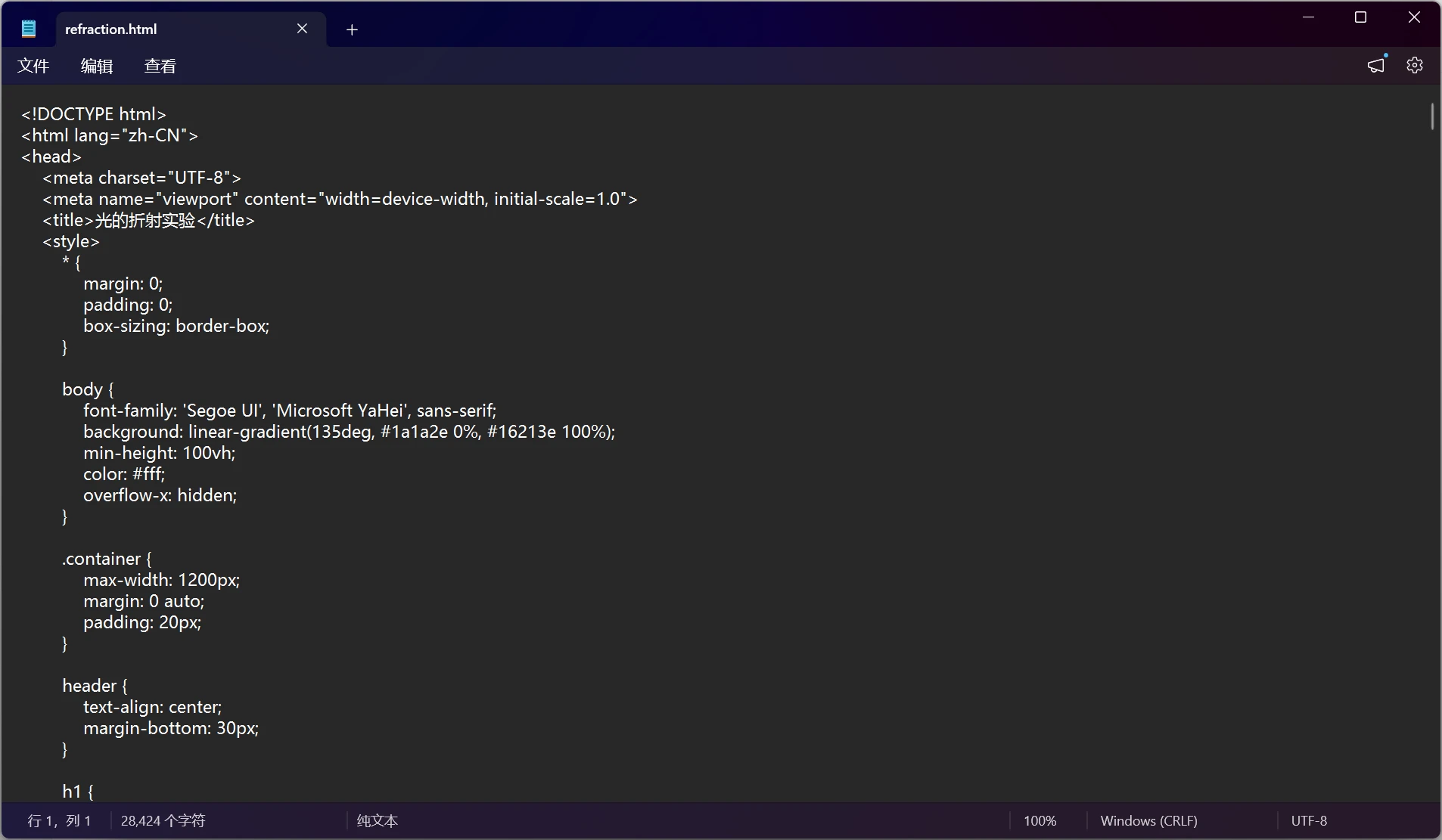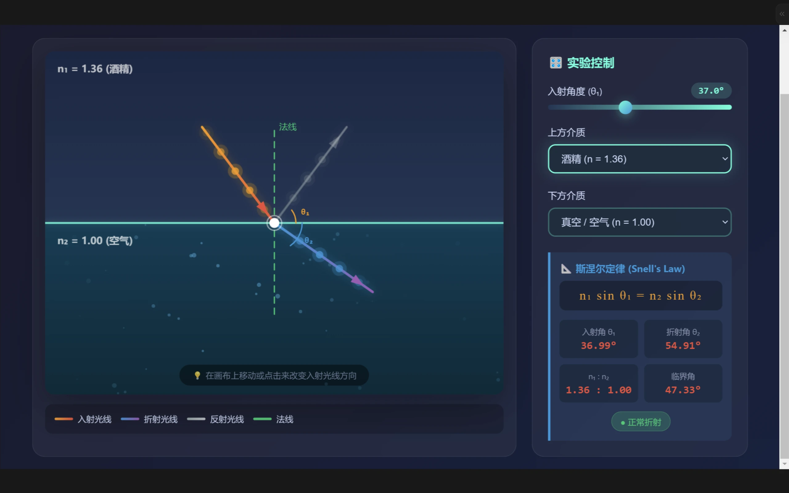帮我用 HTML+CSS+JS 做一个光的折射 HTML 小实验