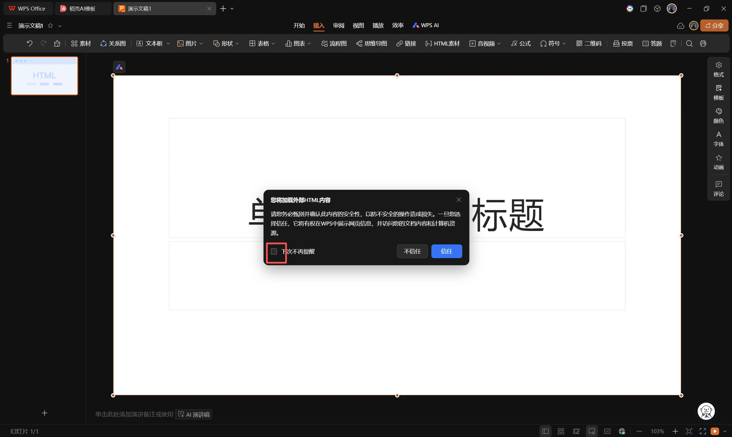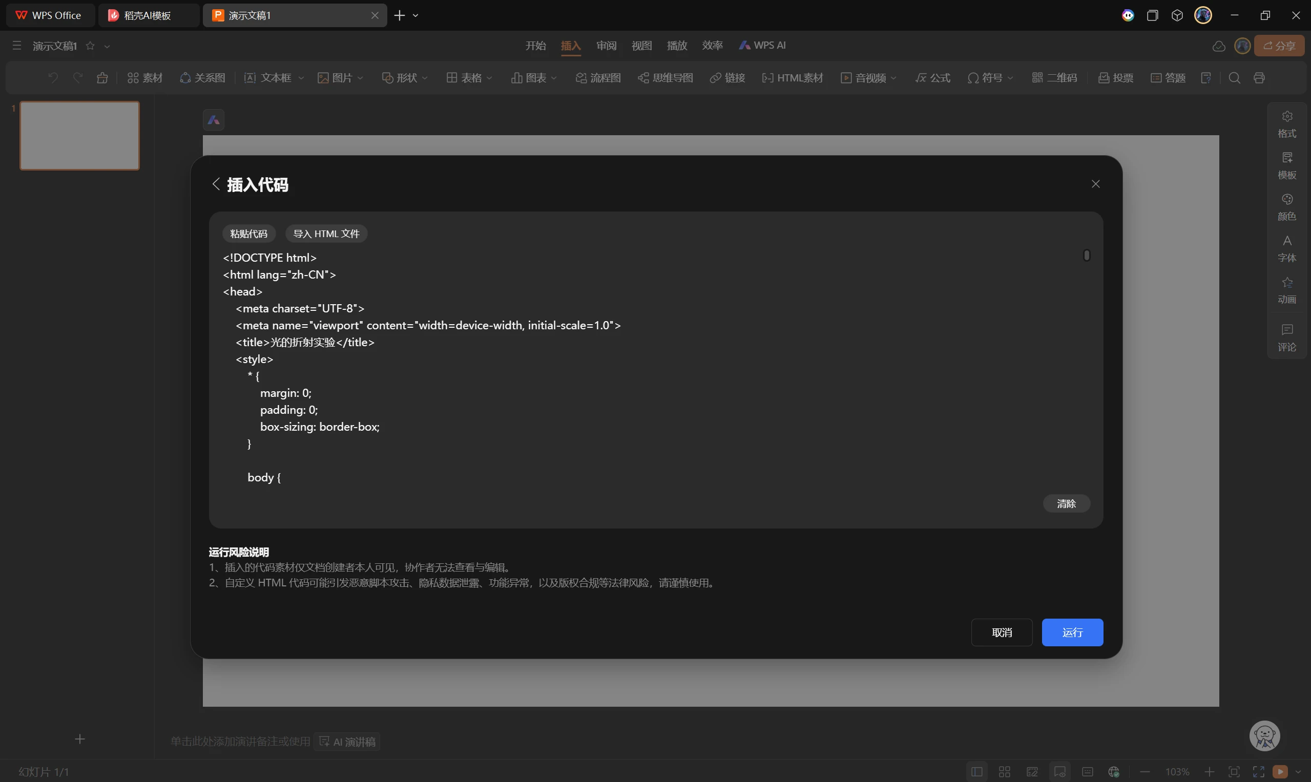 返回 WPS 的「HTML 素材」对话框,粘贴代码后点击「运行」(也可直接导入)。首次运行时会弹出安全提示,勾选「下次不再提醒」然后点击「信任」即可。