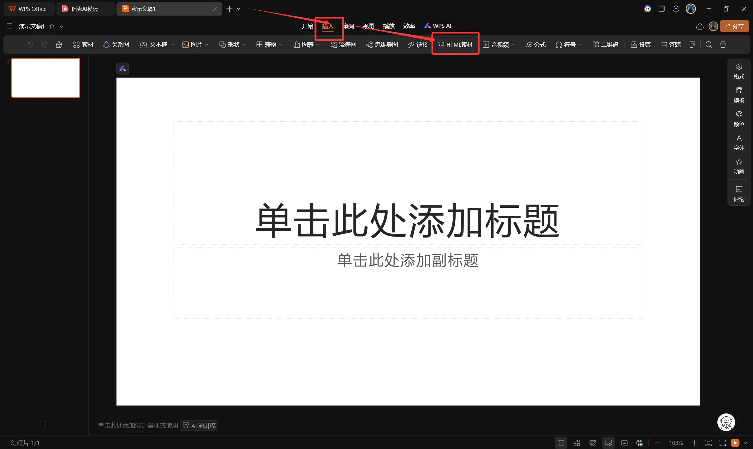 切换到协作模式后,在顶部选项卡中选择「插入」→「HTML 素材」。