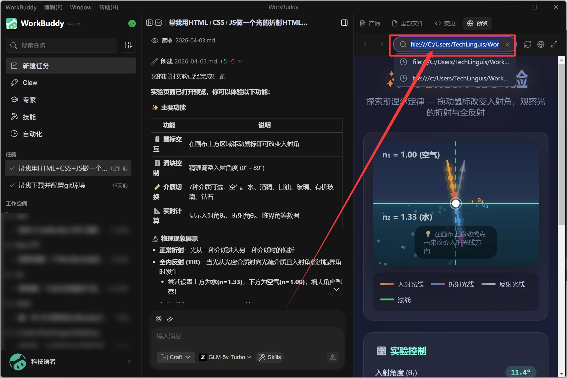 - 返回 WorkBuddy,在旁边的预览窗口复制文件路径